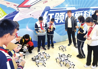 在科技创新展区,一个个新奇的“小发明”让孩子们眼前一亮。智能显微镜下,微观世界清晰呈现;3D打印笔上下“飞舞”,立体的艺术摆件便跃然眼前;灵活的机器狗整齐列队,跟着节拍舞动,引来阵阵欢呼。