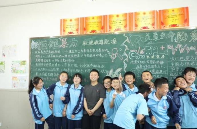 周思武(左四)支教时与孩子们在一起合影(央广网发 天津美术学院供图)