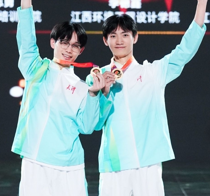 胡亮(左)与同伴斩获金牌(央广网发 天津职业技术师范大学供图)