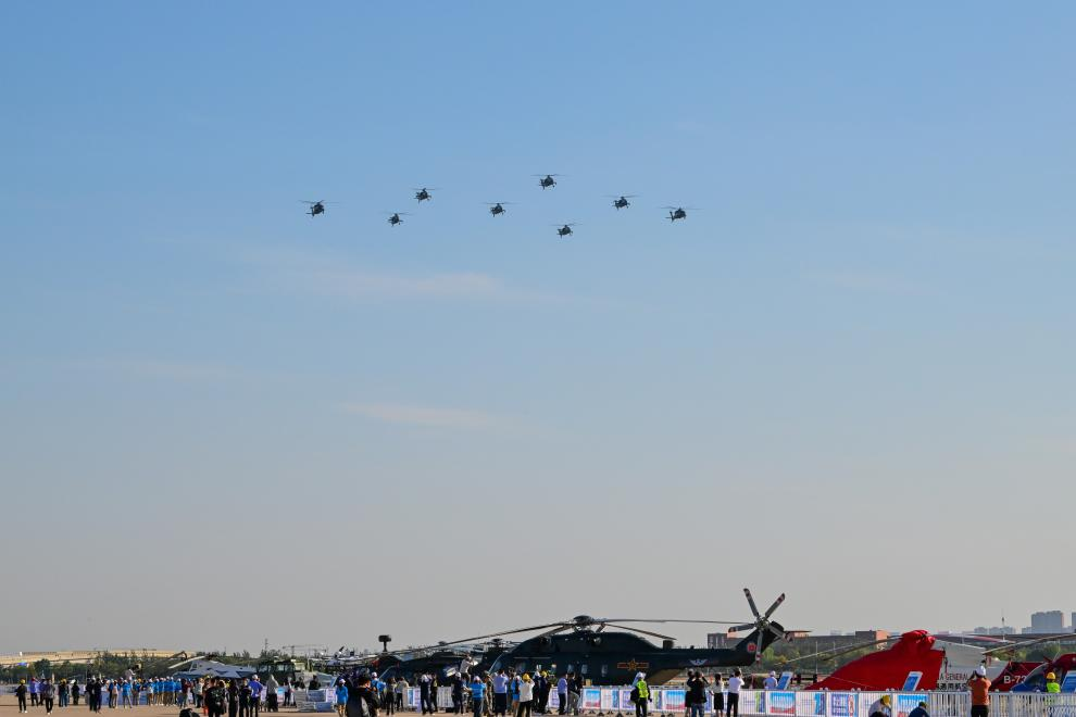 本届直博会参展参演直升机、无人机及电动垂直起降飞行器共计52架,其中直升机38架。主要包括陆军直-10、直-20/20T、航空工业AC312E、AC311A和莱昂纳多AW139、空客H135等全球主力机型。
