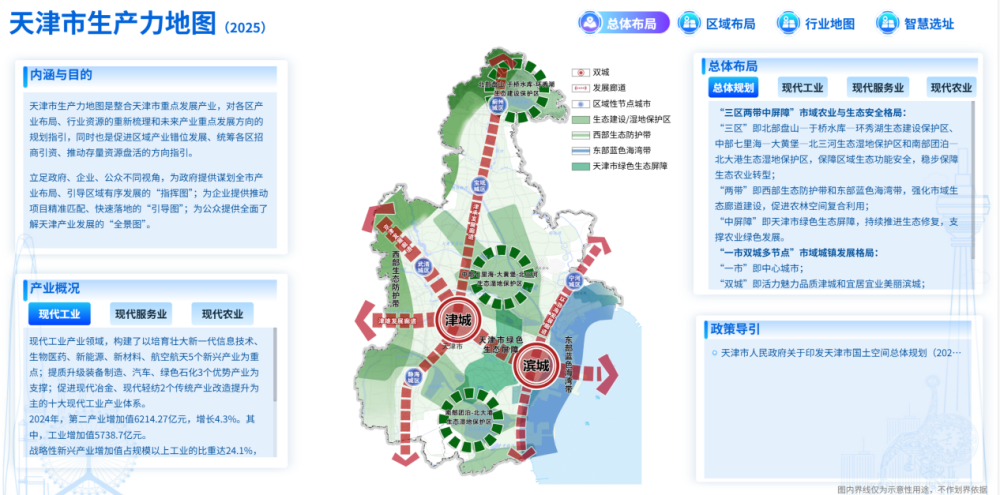 “十四五”规划收官之年,天津首次发布《天津市生产力地图(2025)》,为城市高质量发展写下生动注脚。点开这张 “生产力地图”的 “智慧选址”界面,输入 “滨海新区”“环城四区”“现代工业”等关键词,屏幕上瞬间弹出30余个匹配地块,土地性质、配套设施、政务服务、政策支持等信息一目了然,这成为“十四五”期间天津以数字化赋能产业发展的典型缩影。