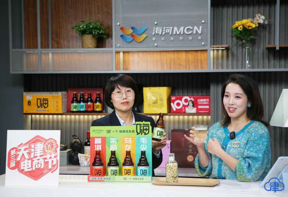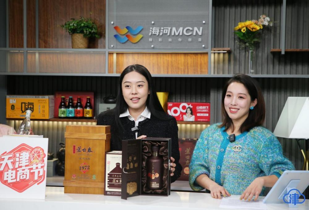 天津芦台春酿造有限公司副总经理北酱酒业有限公司总经理李梦(左)带新品走进“天津电商节”直播间