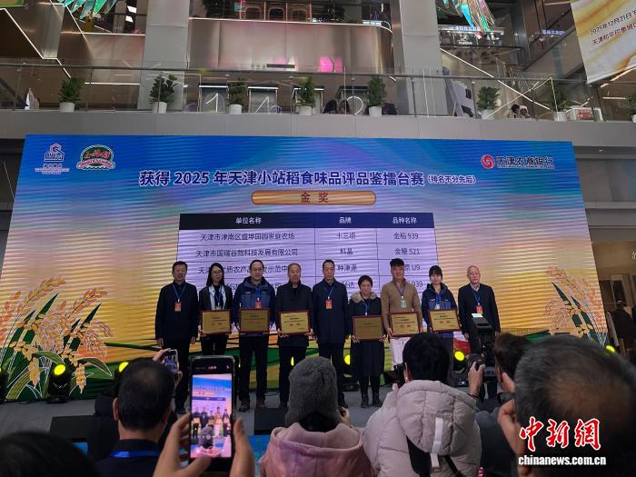 在2025年天津小站稻食味品评品鉴擂台赛上,齐熙彬、孙振菊夫妇经营的“盛坤田园家庭农场”的金稻939,获得了代表最高品质的食味金奖。(受访者供图)