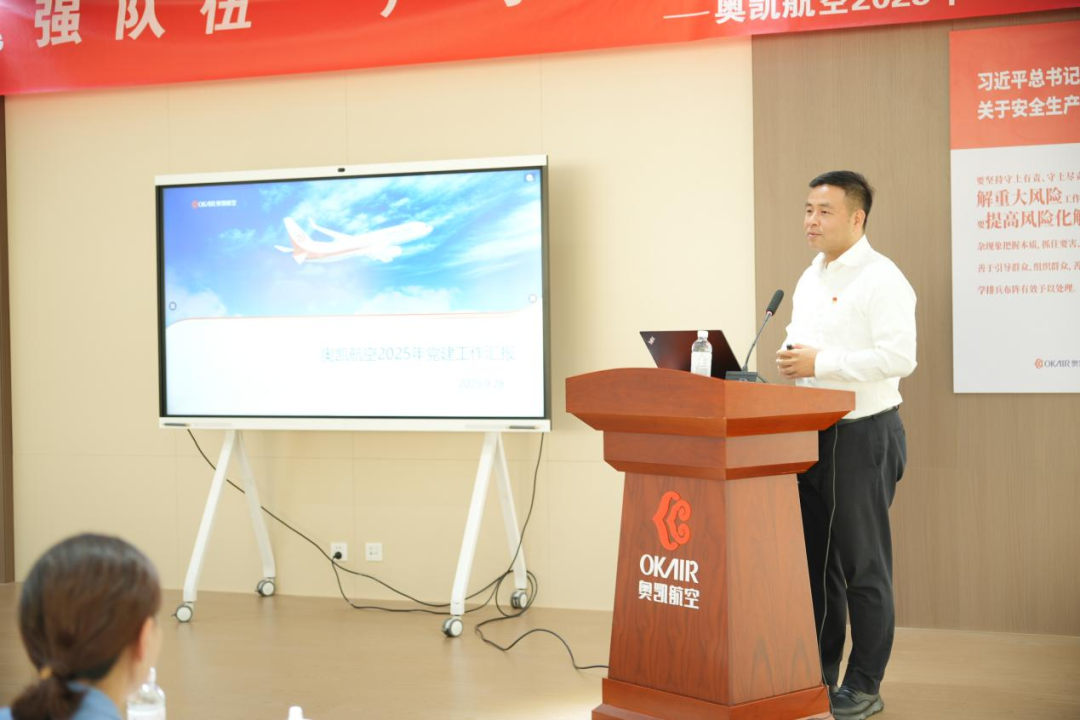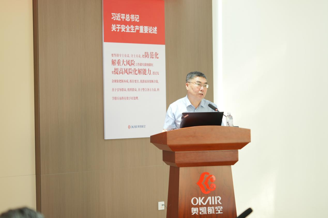 奥凯航空有限公司总裁李铁致开场辞。他表示,本次大讲堂是奥凯航空2025年“廉洁文化月”系列活动的重要组成部分,既是深入贯彻落实新时代党的建设总要求与民航安全工作部署的具体行动,也是奥凯航空以党建为引领、夯实安全根基、推动高质量发展的重要契机。在民航局、华北管理局、天津监管局以及天津港保税区“两新”组织党委的关心指导下,公司全体员工凝心聚力、攻坚克难,在保障飞行安全、提升服务质量、推动队伍建设等方面取得了一定成效。希望各位员工能将所学所悟转化为推动工作的实际行动,进一步强化党建意识、筑牢安全防线,以更加饱满的热情、更加务实的作风,为公司高质量发展贡献力量。