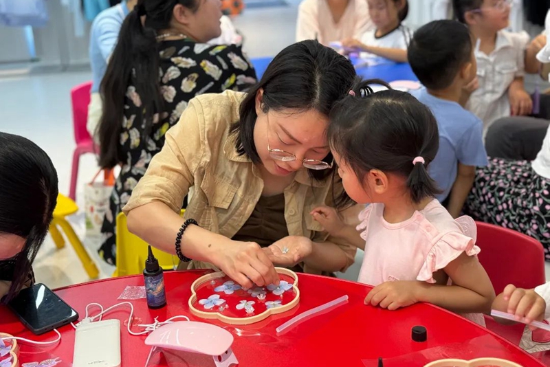 活动伊始,工作人员为每个家庭精心准备了制作材料,并耐心指导孩子与家长协作,用透明胶水勾勒出水波纹的扇面,将珍珠、花朵、叶片点缀于扇面上,让自然之情流动开来,每一把水扇都倾注了创作者的独特构思与情感,现场弥漫着浓厚的国风艺术氛围。在水扇制作过程中,家长与孩子互动交流,分享创作心得,不仅锻炼了孩子们的动手能力,更增进了亲子间的情感联结。当一把把精美的水扇在手中诞生,成就感和喜悦之情溢于言表,参与家庭纷纷表示,这样的活动不仅让他们体验到了手作的乐趣,更让他们对国风艺术有了更深刻的认知和热爱。悦悦小朋友的妈妈笑着说:“我家孩子平时比较内向,今天看到她这么积极地参与活动,还主动和别的小朋友交流创作想法,我真的很欣慰。”
