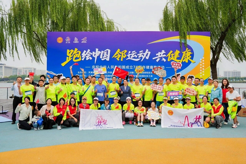 9月27日,为热烈庆祝中华人民共和国成立76周年,天津港保税区职工健康跑俱乐部在风景秀丽的空港东湖南岸,举办了以“跑绘中国•邻运动•共健康”为主题的健康跑活动。众多职工与社区居民齐聚一堂,以充满活力的方式,共同为祖国献上深情的祝福。