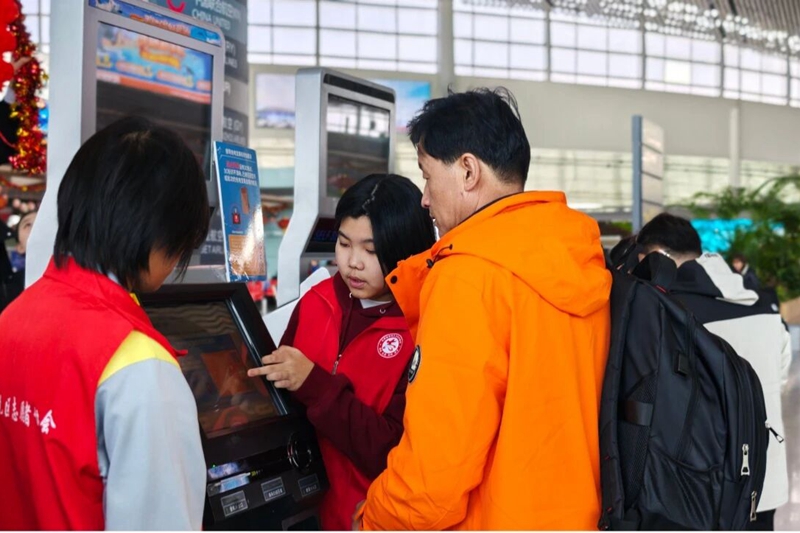 上午9时,志愿服务在航站楼内的实地培训中拉开序幕。志愿者们迅速进入状态,在短时间内掌握了航空公司值机口分布、机场三字代码查询等实用信息,并实地演练了自助值机、行李托运、超规行李处置等全流程服务操作。通过“临时员工证”考核后,这群“红马甲”正式上岗,投入春运服务一线。