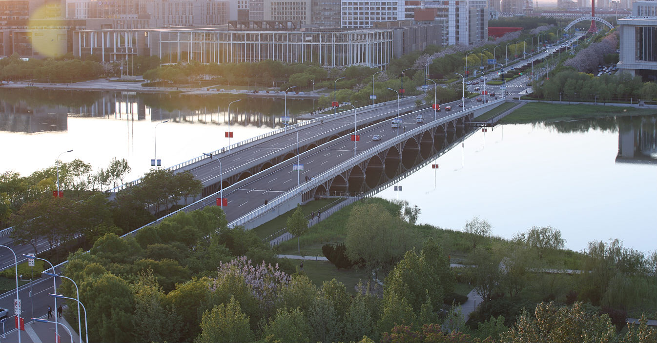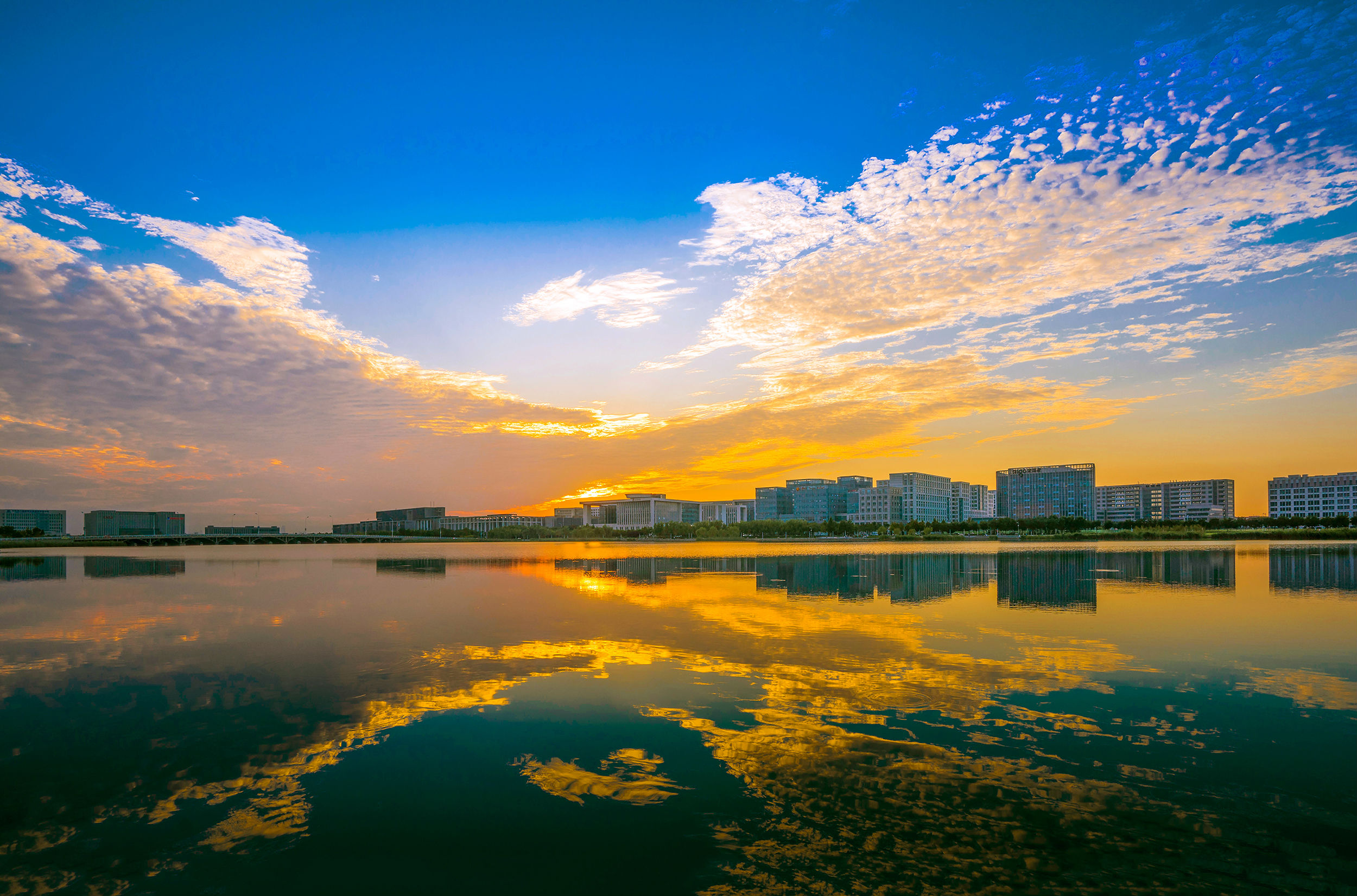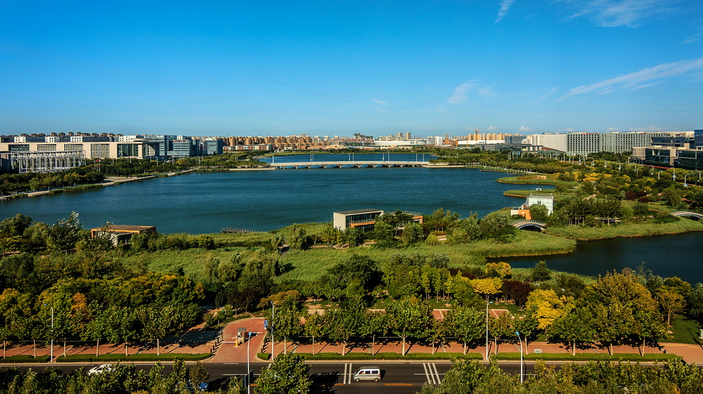 据了解,空港景观湖位于天津港保税区空港区域核心位置,占地40万平方米,以中心大道为界分为西湖和东湖,以西四道湿地为水源,通过东湖循环管道向空港环河排水,是空港环河水系环状循环的中心。该湖采用“雄鹰落地——诗意飞行”的设计理念,借鉴中国传统诗歌中飞鸟秋水的意境并融合现代风格的设计手法,体现了传统与现代的对话。由各种滨水景观元素有机组成的沿湖景观带错落有致,已成为深受群众喜爱的网红打卡地。