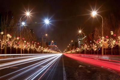 本次亮化妆点工作紧扣“喜庆祥和、节俭创新、安全有序”原则,充分利用往年设施,通过调整布点与创新组合实现“旧物焕新”。红灯笼、中国结、灯球、诗词灯牌、LED灯串及灯光小品等元素交织,营造出喜庆热烈的节日氛围,让市民在漫步中便能体验“火树银花不夜天”的诗意。其中,全新制作的主题灯光小品《展卷·新程》尤为引人注目。它坐落于临港商务大厦前,以立体画轴之形,凝流动线条为势,将“十五五”蓝图融入光影。作品中央“凭海临空,向新而行”的标语清晰醒目,整体造型尽显区域的奋进姿态。