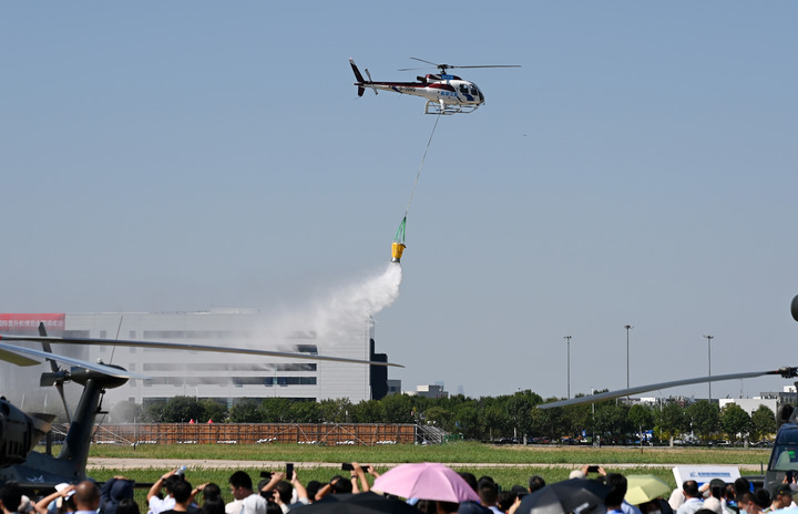 其中,2022年5月成功首飞的AC313A备受关注。该机为大型多用途民用直升机,最大吊挂起飞重量为13.8吨,洒水能力5吨,可运输28名乘员。工作人员向观众介绍说,它进一步提升了我国直升机在高原地区的航空救援能力,还可以在加装应急漂浮系统后执行海上救援任务,满足全疆域全天候多用途的需求。