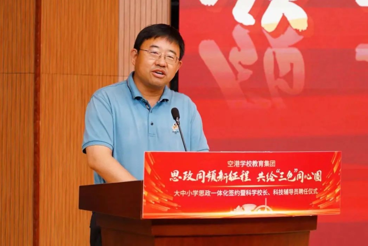 近日,“思政同频新征程 共绘‘三色’同心圆”大中小学思政一体化签约暨科学校长、科技辅导员聘任仪式在天津港保税区空港学校举行。天津市教委学生处处长杨明、天津港保税区文教局局长沈习春和滨海新区教育体育局相关工作室、天津外国语大学马克思主义学院、中国民航大学马克思主义学院相关负责同志出席,天津港保税区空港学校科学校长、科技辅导员和来自两所高校及各集团校的师生代表等参加。