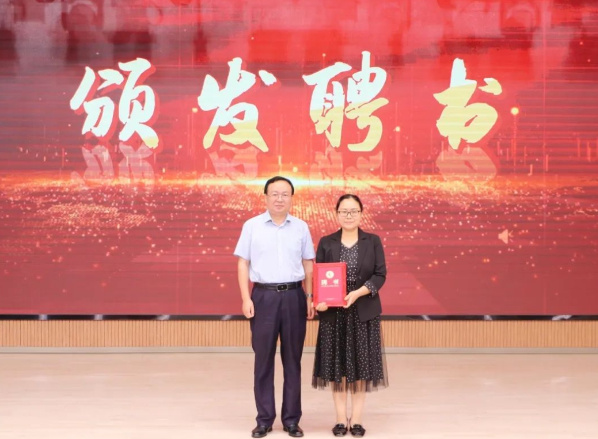 沈习春为南开大学王槿教授颁发空港学校教育集团科技辅导员、空港学校科学校长聘书。与会领导共同为学校82位班级科技辅导员颁发聘书。