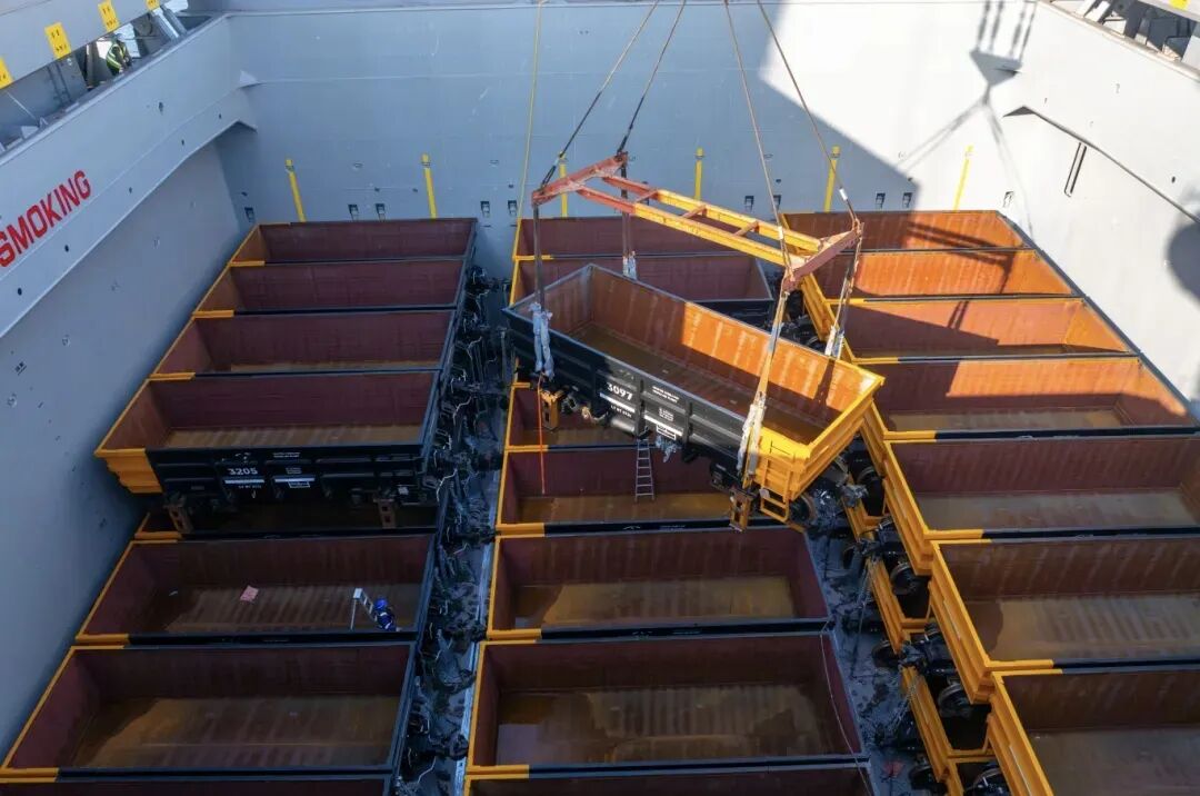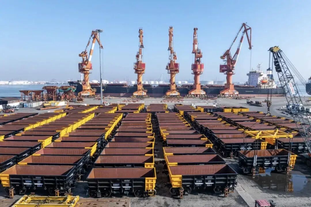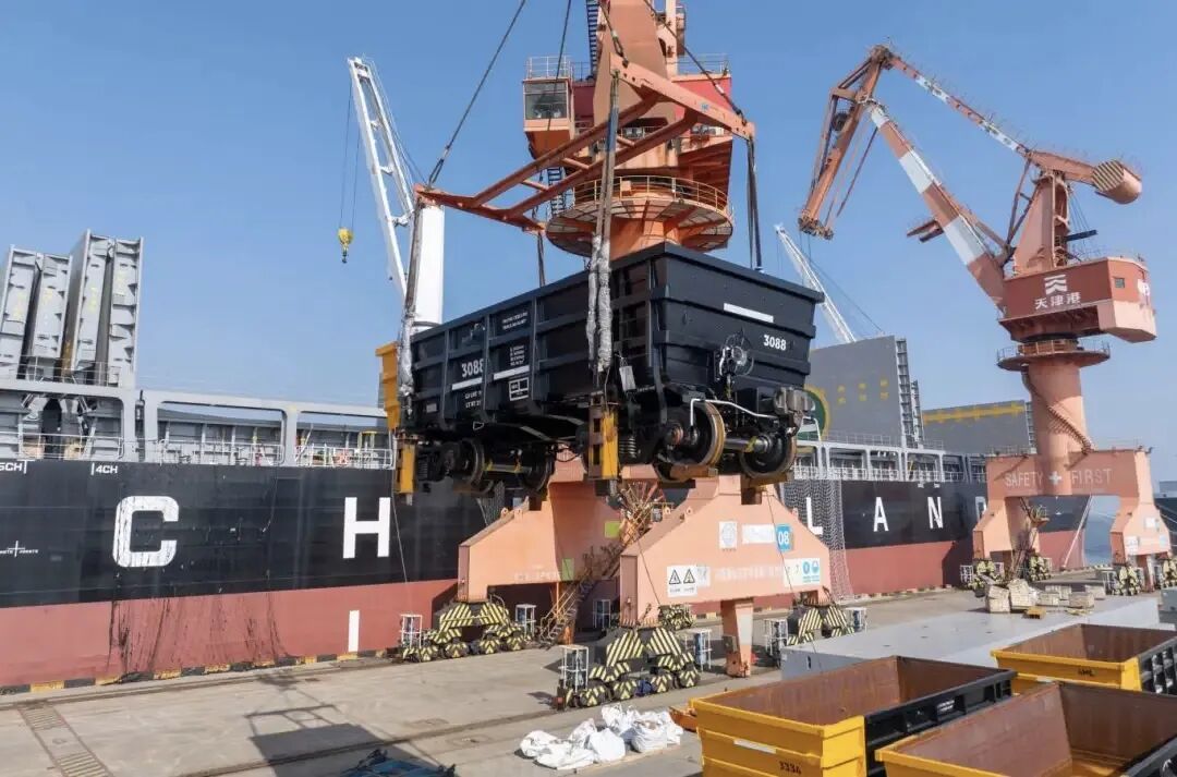 近日,数百辆国产铁路矿石车在天津临港控股下属港务集团码头完成装船作业,随后由“自由”轮承运,发往非洲大陆。