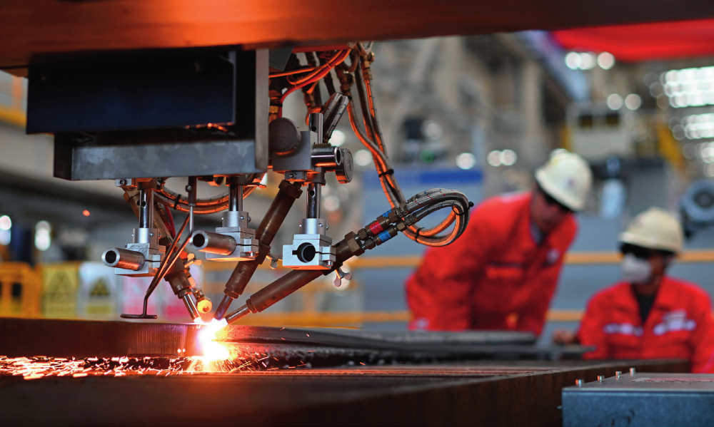 图片工作人员在海油工程天津智能制造基地制管作业车间调试数控切板机 (2024年10月10日摄) 赵子硕摄/本刊