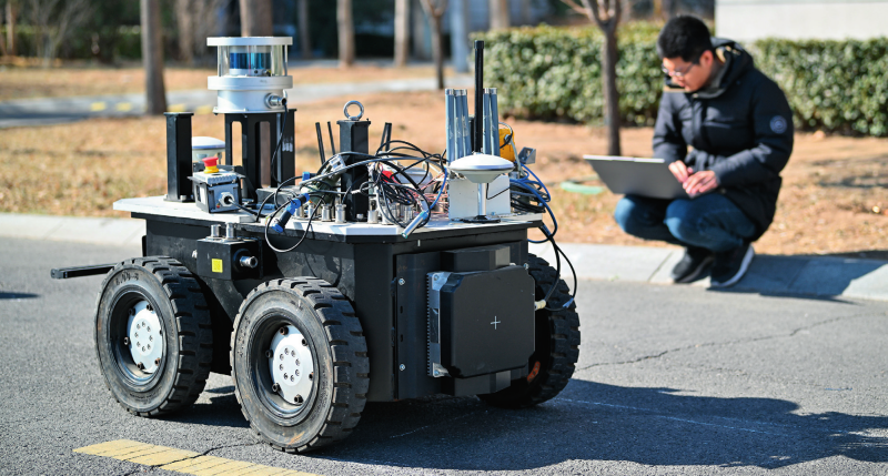 图片工程师在京津中关村科技城道路上对一款防爆轮式巡检机器人进行路测调试(2025年2月20日摄)孙凡越摄/本刊
