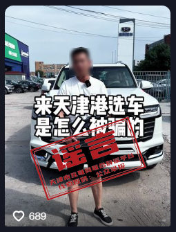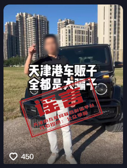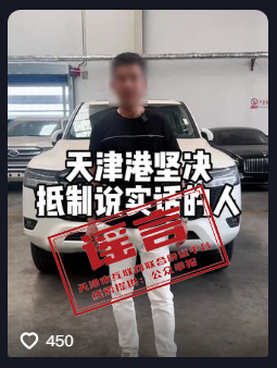 近期,天津港保税区党建工作部(网信办)接到网民举报,抖音短视频平台账号“天津港李宁说车”(抖音号:liningYWZQ,IP属地:天津)发布多条信息,称“天津港车贩子全都是大骗子”“天津港车商只会坑蒙拐骗”“天津港坚决抵制说实话的人”“来天津港选车是怎么被骗的”。上述内容均为谣言。