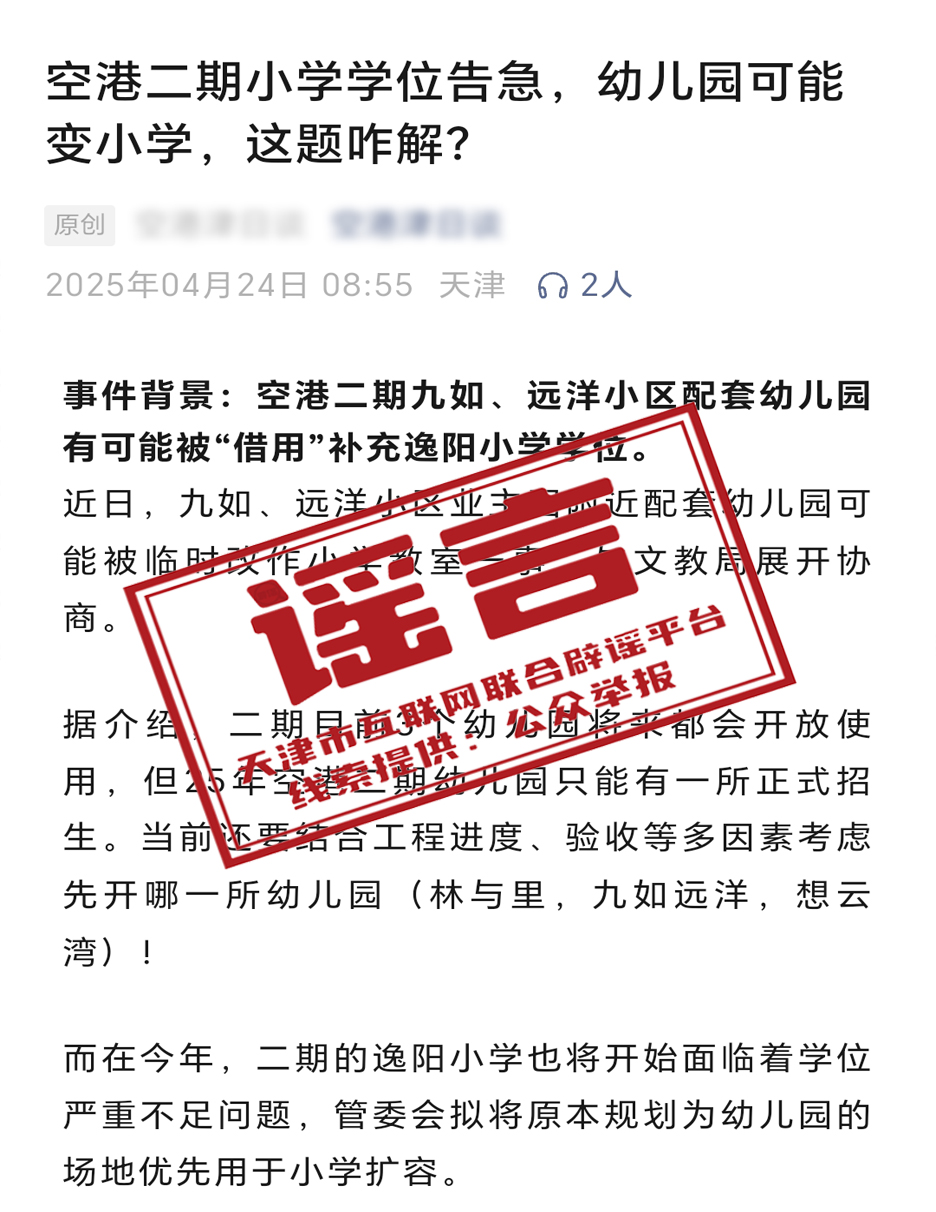 近日,网络平台个别自媒体账号发布信息,称“空港经济区二期九如、远洋小区配套幼儿园今年不开放,要被借用补充逸阳小学学位”。经向天津港保税区文教局核实,九如、远洋小区配套幼儿园严格按计划推进开办工作,今年开放,天津逸阳空港小学学位充足。关于“九如、远洋小区配套幼儿园今年不开放、学位借用”言论,属失实信息。